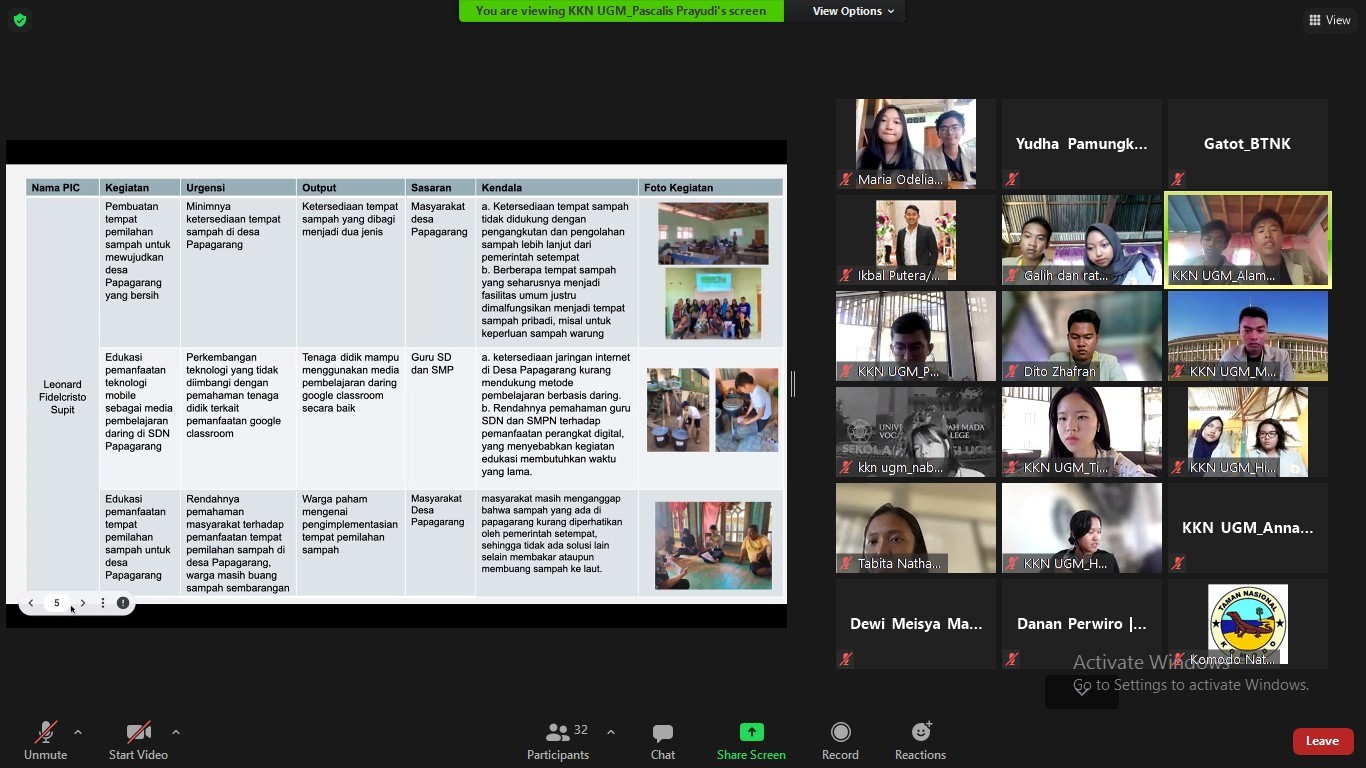 Labuan Bajo, 10 Agustus 2022. Mahasiswa Universitas Gajah Mada melakukan presentasi di Balai Taman Nasional Komodo terkait Kuliah Kerja Nyata-Pembelajaran Pemberdayaan Masyarakat (KKN-PPM) Komodo 2022. Sebanyak 30 orang mahasiswa dari empat fakultas yang tergabung dalam KKN PPM Komodo 2022 Universitas Gajah Mada menghadiri kegiatan presentasi melalui zoom meeting pada tanggal 10 Agustus 2022. Kegiatan presentasi daring ini turut dihadiri oleh jajaran pimpinan dan staf lingkup Balai Taman Nasional Komodo serta seluruh mahasiswa magang dan penelitian di Balai Taman Nasional Komodo.